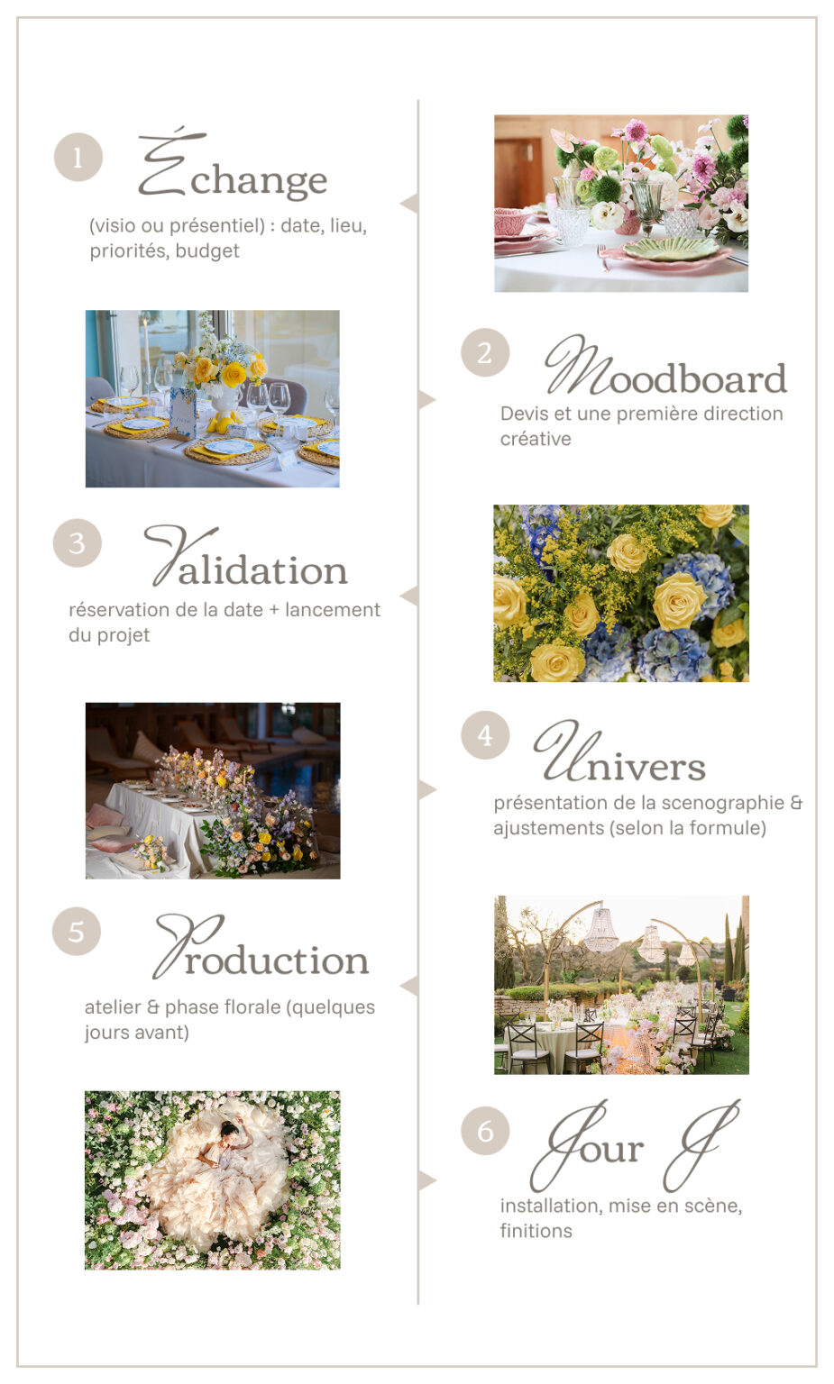 Premier échange (visio ou présentiel), puis moodboard + devis. Selon la formule, je construis un book scénographique, j’organise la visite technique, la production en atelier et la phase florale. Le jour J : livraison, installation, mise en scène et finitions.